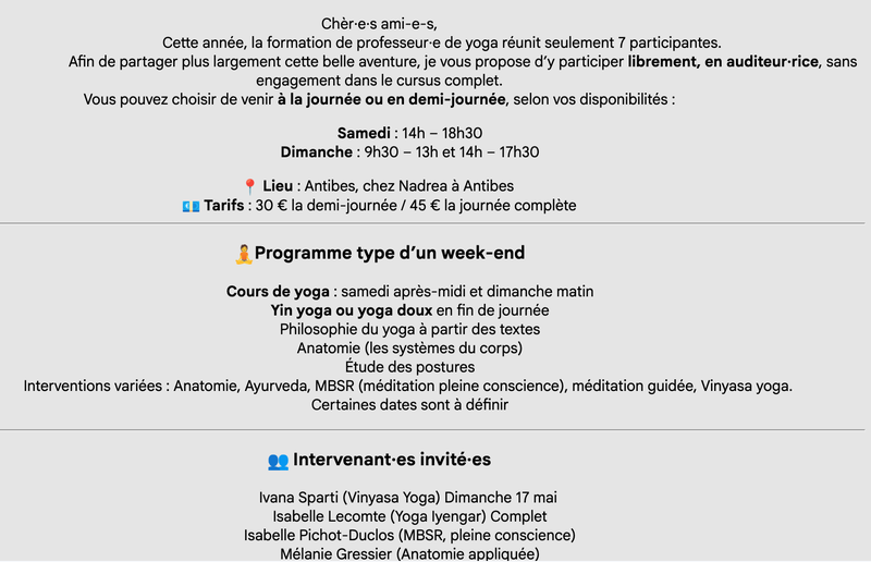 - Nous vous proposons une pratique englobante, basée sur la détente, le renforcement musculaire et l'assouplissement du corps, nourrie par un savoir ancestrale alliant les différents courants du yoga.